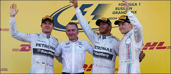 Após um fim de semana de muitas emoções, Sochi foi palco de mais uma vitória de Lewis Hamilton e de outra dobradinha da Mercedes. A marca germânica sai da Rússia com o seu 1º título de Construtores, um feito notável após uma época em que claramente estiveram acima da concorrência. Valtteri Bottas, em Williams Mercedes, encerrou um pódio completamente dominado pelos motores alemães.