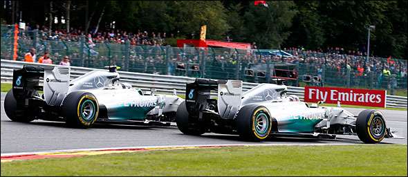 Na 2ª volta deu-se o incidente que ditou o rumo deste Grande Prémio. Na abordagem a Les Combes, Rosberg tentou ultrapassar Hamilton por fora e o britânico não cedeu a trajectória, levando ao toque inevitável dos dois pilotos. Enquanto a asa dianteira de Rosberg sofreu alguns danos que comprometerem o seu desempenho aerodinâmico, o pneu traseiro direito do Mercedes W05 de Hamilton não resistiu ao impacto. Uma paragem forçada nas boxes para troca de pneus acabaria por condicionar a estratégia de corrida do piloto britânico.
